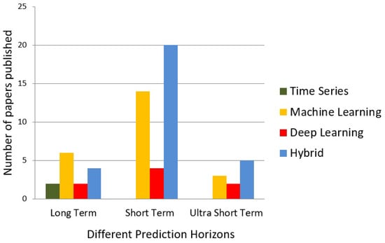 In this paper, we have systematically investigated WPP methods based on different prediction horizons, algorithms and evaluation criteria. In this review, we present detailed documentation of various algorithms, their performance and discussions. Wind power forecasting can be categorised depending on prediction horizon or prediction methodology. In Table 1 prediction horizons and the corresponding time range are listed. According to the prediction horizon, they can be categorised as long-term, short-term or ultra-short-term methods. Prediction methodologies are classified as physical, statistical and hybrid methods. With the recent developments in computing power and ML techniques, the statistical methods are further classified as time series methods, machine learning methods and deep learning (DL) methods. Hybrid methods are a combination of different prediction methodologies; it can be a combination of time series and ML or ML and DL or a combination of all of them. In this article, we have followed the prediction horizon for the categorization of WPP methods and, for each category, related prediction methodologies are discussed. The statistics of the number of articles referred to in this article are shown in Figure 1. In this review, we have considered articles published on WPP after 2015. It is clear from Figure 1 that recent research in this field mainly focuses on short-term wind power prediction.