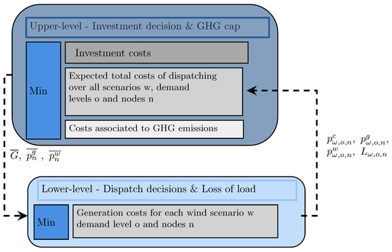 In order to tackle this problem structure, a bi-level approach is taken. Each level represents the different stage of decision-making, as well as different costs accruing. On the upper level, the amount of investment in each asset at each node is decided upon, taking into account the cost ensuing at the generation phase, depending on these investment decisions. Moreover, the social planner decides on an emissions’ reduction policy, taking into account the GHG emissions accruing at the dispatch level.