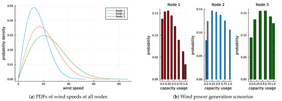 Due to the mountains separating the three locations, we assume them to be sufficiently geographically isolated for the wind speeds to be independent of one another. The probability density function (PDF) of wind speeds can be expressed as a Rayleigh distribution, as a function of the area’s average wind speed [44]. Figure 3a shows the distributions of wind speeds at each node, given the locations’ respective average wind speeds. We discretise the PDFs into 10 scenarios with an assigned probability at each node by means of a Monte Carlo Simulation approach. The function to transform wind speeds into electrical power is assumed to be linear between cut-in speed and rated speed and is taken from [45]. The cut-in-, rated- and cut-out speeds are chosen at 8, 31, and 51 MPh, respectively. Using this, we transform each scenario’s wind speed into the capacity usage in that scenario to attain parameter , resulting in the scenarios shown in Figure 3b. This in hand, we construct Kronecker’s product of all independent scenarios to acquire our entire set of stochastic scenarios. We moreover assume that the transmission line capacity is equal between all nodes and that there is no transmission loss, i.e., the line susceptance is equal to the line’s transmission capacity .