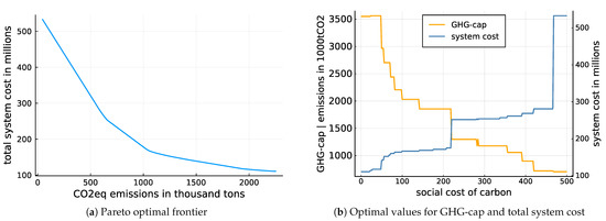 (a) shows the Pareto optimal frontier for trading off the total cost of generation against total GHG emissions. Every point on the shown frontier is an optimal solution with respect to the policymaker’s a priori preference relation regarding both objectives; (b) shows the resulting policy decision dependent on the chosen level of SCC, as well as the associated expected total system cost in millino $US.