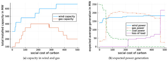 We moreover analyse the effect of different SCC preferences on capacity investment and the implied expected generation. Figure 5a shows the cumulative optimal investment decisions in both wind- and gas turbines for each SCC. It can easily be seen that investment in gas infrastructure becomes increasingly important at medium levels of SCC, when replacing coal, while quickly decreasing at higher levels as a result of being itself replaced by both wind turbines with relatively low capacity factors and by loss of load. Figure 5b shows the cumulative expected generation by asset, also including loss of load, with respect to SCC. Unsurprisingly, emission-intensive coal production is dropping very quickly with increasing levels of SCC, being replaced by natural gas. Notably, the expected wind power production is relatively unchanged over the preference space, even though the investment in wind turbines increases quite constantly. This can be explained by the limitation in transmission capacity. While installing wind turbines in at the mountainous node 3 and even at the moderately windy node 2 is always somewhat attractive, the maximum transmission capacity to the load hungry node 1 is always 75 MW. The increases in wind power capacity with rising SCC are simply replacing coal and gas generation in lower wind speed scenarios. Again, from an SCC of $468 onwards, one can easily see that the decrease in expected gas power generation is fully compensated by additional loss of load.
