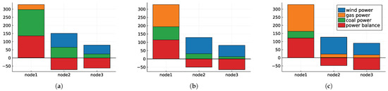 Figure 6 shows the nodal power balance for three distinct scenarios under our experimental specification. Figure 6a depicts the corner case in which the societal detriment of GHG emissions is fully disregarded. It can easily be seen that power generation in this scenario relies mostly on cheap coal, while there is still some investment in wind power capacity at nodes 2 and 3. Figure 6b depicts a case in which the cost of carbon is valued at $50, roughly the magnitude of the mean value found in the review study by [41]. The largest difference to the first case is that the power consumption at node 1 is now mostly covered using gas power. Moreover, a larger proportion of the load demanded at both nodes 2 and 3 is supplied using wind power. The third case depicted in Figure 6c shows the expected power generation at a higher level of SCC at $180 per tCO2 under our specification. This value resembles the call that Fridays for Future Germany put out for an official “fair” emissions price [55], and also roughly equals the 2020 mean estimate of environmentalist think tank Resources for the Future [56].