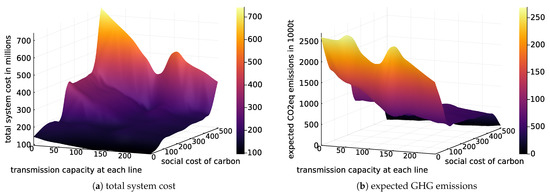 (a) shows the total system cost in millions of $US with respect to both the valuation of GHG emissions and the transmission line capacity; (b) shows the CO2eq emissions for the same observation space.