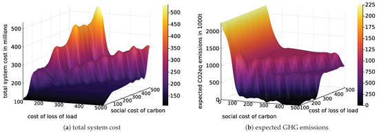 Notably, the resulting optimal decisions are highly dependent on the combination of both valuations, not just their absolute height. This is true for the total system cost in particular. Figure 8a shows that the highest total cost is actually incurred at medium levels of the cost of loss of load, combined with a high SCC. This can be explained by the fact that, at this configuration, loss of load is so costly that it substantially increases the total incurred cost, while still being sufficiently small in comparison to the social cost of carbon to make a lower service level acceptable. Figure 8b yields relatively foreseeable results. Unsurprisingly, total emissions are highest in any case if SCC is assumed very small. On the other hand, the most mitigation is achieved when the cost of unserviced load demand is valued only little in comparison to GHG emissions, as it then becomes more attractive to simply generate less electricity to decrease emissions.