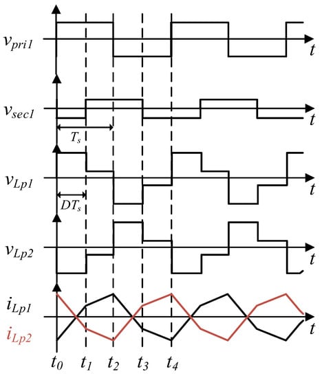 As shown in Figure 3, phase 1 HBDAB consists of four MOSFETs S1–S4, a transformer Tr1, a series inductor Lp1, and two-bridge capacitors C1–C4. The key waveforms of the proposed converter are shown in Figure 4. It is assumed that vpri1 and vsec1 are the output voltage of the primary and secondary phase 1 HBDAB; iLp1 and iLp2 are the currents through phase 1 and phase 2 series inductors. Ts is the output current ripple period, and it is equal to 1/2fs, where fs is the switching frequency. For the mode analysis, there are some assumptions to simplify the circuit analysis:
