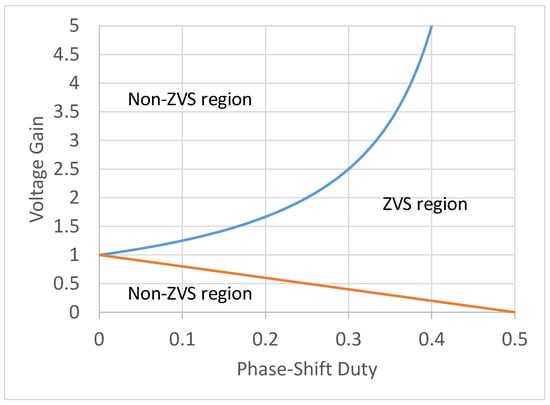 Based on these formulas, Figure 6 shows the ZVS region. Notice that the HBDAB is difficult to enter the ZVS region under a light-load situation with lowering the phase-shift duty. Therefore, under light load conditions, the converters may lose soft switching characteristics, which will cause large switching losses of the switches. Instead of using phase-shift modulation for the power flow control, a variable-frequency modulation is adopted in this paper. In order to ensure the ZVS condition in a wider load range, the phase-shift duty is set at a constant value of 0.5. The advantage of this control method is that the operating point always lies in the ZVS region, as shown in Figure 6. The variable-frequency modulation is used to control the overall output power. For the battery balance control, the phase-shift modulation is used to adjust the individual output power for each battery module. Therefore, low battery and DC-bus voltages can be accomplished.