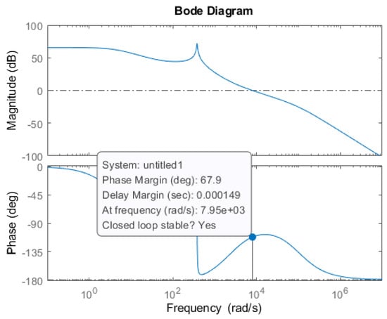 where ωc, ω0, Kp, and Kr are the equivalent bandwidth, the resonance frequency, proportional gain, and resonant gain, respectively. Figure 9 shows the Bode plots of the current loop transfer function Ti(s) with Kp = 0.05, Kr = 10, ωc = 6.28 rad/s, and ω0 = 377 rad/s. In UCM, the DC bus voltage of the inverter is 380 V, and the values of the output inductor are 2.5 and 0.2 mH. This current controller can achieve a phase margin of 66 degrees with stability.