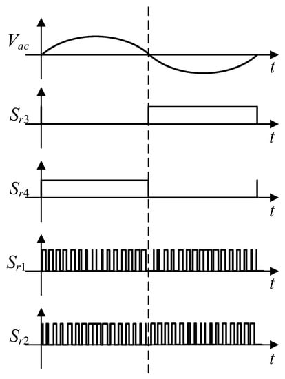 The circuit diagram for the proposed bidirectional converter is shown in Figure 3. It consists of two battery modules represented by the DC source, two HBDAB converters, and one H-bridge inverter with sinusoidal pulse width modulation. The H-bridge inverter is connected to the ac grid with an LCL filter, which avoids the resonance between the output capacitor and the parasitic inductor of grids. The H-bridge inverter switches (Sr1–Sr4) and HBDAB converter switches (S1–S8) are considered to use metal–oxide–semiconductor field-effect transistors (MOSFETs).