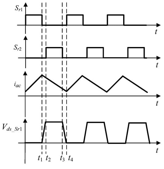 In TPCM, the switches Sr1 and Sr2 are faster switching, and Sr3 and Sr4 are slower switching. The operation of the H-bridge inverter can be generally divided into different operation modes for improving conversion efficiency. The high-frequency switching leg is responsible for controlling the current of the output inductor. In other words, the switches can be designed as a pair of boost/buck converters in a half-line cycle of the grid voltage. During the positive half-cycle of the grid voltage, the switch Sr4 is turned on while Sr3 is turned off. For the negative half-cycle, switch Sr3 is turned on, and switch Sr4 is turned off. Since this low-frequency switching leg is only switched at zero crossing of the grid voltage, its switching loss can be neglected. Based on the following assumptions, the control waveforms of the H-bridge inverter in TPCM are shown in Figure 10. Figure 11 shows the typical waveforms of the high-frequency switching leg in TPCM. At t = t1, the switch Sr1 starts turning off. Meanwhile, the other switch Sr2 remains off, and the inductor current starts discharging. Thus, the drain-to-source voltage of Sr1 starts increasing to the output voltage until t = t2. At t = t2, Sr2 starts turning on, and the inductor current discharges continuously until t = t3. At t = t3, Sr2 starts turning off, and the drain-to-source voltage of Sr1 starts decreasing until t = t4. At t = t4, Sr1 is turned on. Meantime, the other switch Sr2 remains off, and the inductor current starts charging.