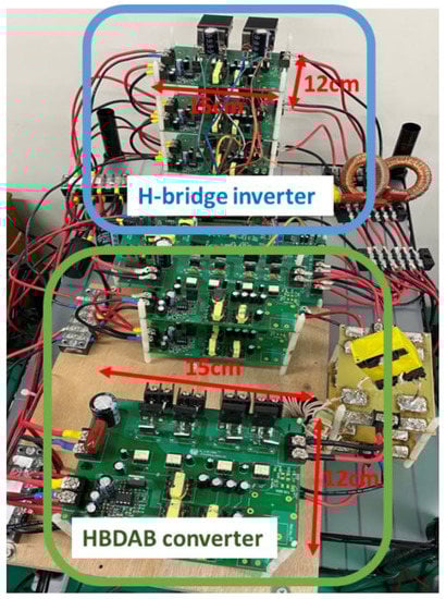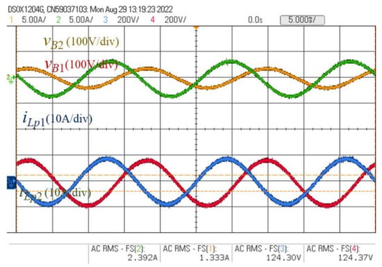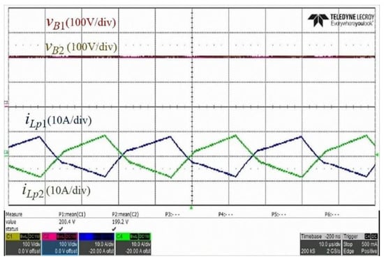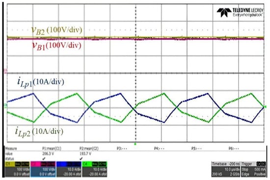 A prototype of the proposed bidirectional converter, which is composed of two sets of HBDAB modules and an H-bridge inverter, was built and tested with the multi-mode control strategies. The prototype specifications are listed in Table 1. Figure 13 shows the picture of the prototype converter with the proposed control strategies by using a DSP TMS320F28335. A voltage source in parallel with a resistor is used to estimate the battery charging and discharging for the HBDAB converter. Figure 14 shows the experimental waveforms of the gate-to-source and drain-to-source voltage waveforms for S1 and S2 to illustrate that ZVS can be achieved. The key experimental waveforms of the HBDAB converter are shown in Figure 15 and Figure 16. Figure 15 illustrates the key waveforms of the series inductors. Figure 16 shows the experimental waveforms of the battery voltage and current of the transformers. It can be found that the experimental waveforms are consistent with the theoretical ones. In this paper, the proposed HBDAB converter is designed to control the output power individually for each battery module. To verify the individual control capability of the battery module, Figure 17 and Figure 18 are presented the corresponding waveforms under the unbalanced power condition. In Figure 18, the battery voltage of module 1, vB1, is about 206 V. The battery voltage of module 2, vB2, is about 194 V. The individual phase-shift modulation is used to deal with the unbalanced current and voltage between the battery modules.