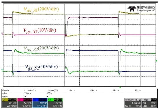 Experimental waveforms of the gate-to-source and drain-to-source voltage waveforms for S1 and S2.
