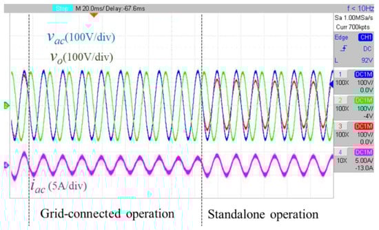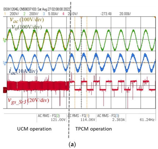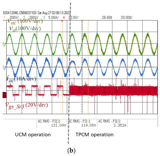 In order to verify the feasibility of the proposed control strategies, the experimental hardware was also tested for the grid-connected mode and the standalone mode. Waveforms of the H-bridge inverter output voltage vo, the grid voltage vac, and the inverter output current iac are shown in Figure 19. The dotted line indicates the real starting point of entering the standalone mode from the grid-connected mode. Conventionally, it is very common that a current drop or spike can easily occur in this duration when the H-bridge inverter switches the controller from the grid-connected mode to the standalone mode. On the contrary, Figure 19 shows that there is no current drop or spike during the transition. Figure 20 shows the experimental results of the mode transfer between UCM and TPCM for the proposed H-bridge inverter. Waveforms of inverter output voltage vo, the grid voltage vac, the inverter output current iac, and the gate-to-source voltage of Sr3, vgs_Sr3, are shown in Figure 20a,b. In Figure 20a, the dotted line indicates the starting point of entering TPCM from UCM. It can be seen that the low-frequency legs return to the lower frequency switching without a current drop or spike, while similar experimental waveforms from TPCM to UCM are shown in Figure 20b.