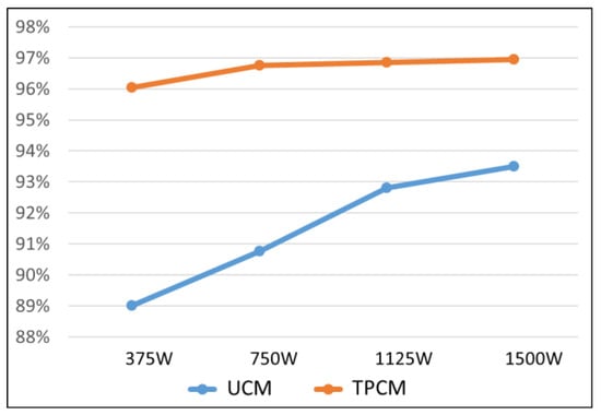 Theoretically, by isolating the DC bus voltage of the HBDAB converter, the proposed control strategies can be applied to control the three-phase system. Figure 21 shows the experimental results of the three-phase system for the proposed H-bridge inverter. There are three DC–AC converters connected to a three-phase system. Waveforms of r-phase output voltage vac1, s-phase output voltage vac2, r-phase output voltage iac1, and s-phase output voltage iac2, are shown in Figure 21. It can be seen that the capability of the unbalanced current control can be achieved for a three-phase system. The power conversion efficiency of the H-bridge inverter under different output power and control modes is shown in Figure 22. The TPCM demonstrated better output performance, with power-conversion efficiency higher than 4% at full load conditions.