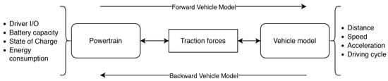 - The backward vehicle model (BVM) starts from already known kinematic quantities and computes traction forces required from the powertrain unit to be generated, estimating the powertrain performance [34].