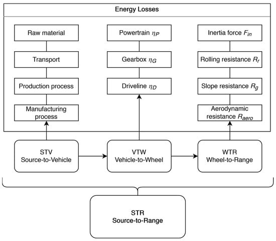 Vehicle modelisation can also be taken into account in a broader analysis of energy consumption, considering all manufacturing processes behind the realisation of the vehicle itself. This approach is called source-to-range (STR) [40]. The novelty of this approach involves considering all of the energy wasted during the entire life cycle of the vehicle. It includes several steps, briefly depicted in Figure 6.