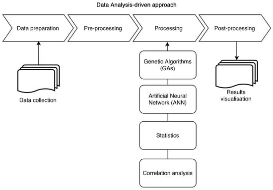 As mentioned before, an alternative approach to solving EV problems is the data-driven analysis approach. This method is useful when a large amount of data is available at the beginning of the analysis. Its blocks are described in the scheme presented in Figure 6. With this approach, the first step is constituted by clustering the data into groups. Big data can refer to driving cycles, driving behaviours, most journeys, traffic observations, or habits from real cases extracted through constant and pervasive monitoring of vehicular circulation [9,10,72,73,74]. Moreover, this approach allows for performing correlation analyses between variables of different natures, thanks to machine-learning techniques [75,76]. The main difference with respect to the vehicle model-driven approach is the absence of a vehicle model [23]. The data-driven analysis approach is capable of including various algorithms, and statistical evaluations can be performed on the data. This implies that the initially acquired dataset, which can be called a ‘raw dataset’, must be properly prepared to be constituted as a confident starting dataset prior to proceeding with the analysis. Within this branch, various approaches can be distinguished. Starting from the scheme of Figure 7, the focus will be set on the “processing” phase, which is the heart of the data-driven analysis approach and where the main differences with vehicle model-driven approaches are grouped. SWOT analysis related to Data Analysis-driven approach is briefly reported in Table 4.