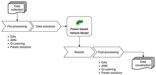 The adoption of a vehicle model-driven approach allows simulation of the behaviour of the whole vehicle, considering partially (or totally) the subsystems of interest, thanks to the vehicle technical specifications that this strategy considers, which are otherwise discarded by the data-driven analysis approach. Moreover, as a result, this method allows for performing a sensitivity analysis, which has a fundamental role as a preliminary assessment of the vehicle performance [5,39,42,47]. Usually, a numerical vehicle model allows for recreating the vehicle itself in a virtual environment. The vehicle model-driven approach is schematised in Figure 2.