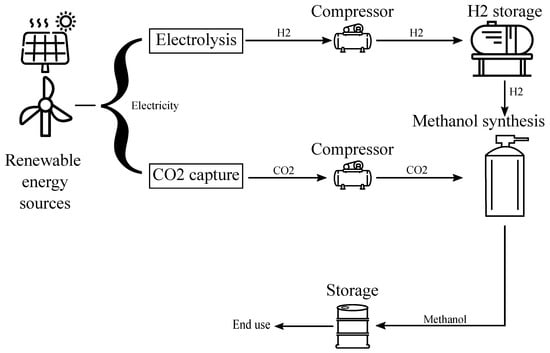 The main structures for each of the P2X processes are fairly similar at the upper level. As an example, a simplified process chain for methanol [24,25] is presented in Figure 1. Renewable energy sources are the starting point; they provide the main energy input in the form of electricity. The produced hydrogen and CO2 are compressed to the operational pressure of the synthesis. Intermediate storage might be required for both hydrogen and CO2, in which gases are stored above the synthesis pressure. After synthesis, there is transportation and storage demand for the produced methanol.