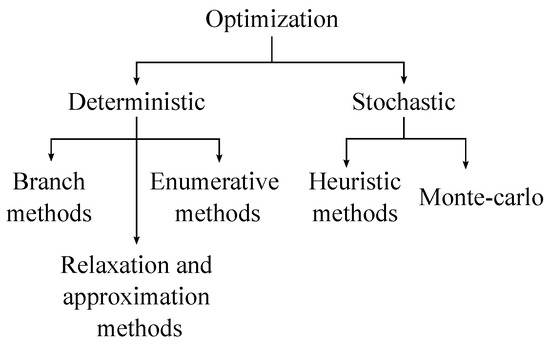 Optimization consists of the selection of the best element from a given feasible space of possible solutions/settings. It involves minimization or maximization of one or multiple variables of a function following a set of constraints. Optimization methods can be divided into two major categories: deterministic and stochastic (see Figure 2). Deterministic methods can reach a definite answer without uncertainty, while stochastic methods reach an approximate answer [50]. Moreover, another significant difference between these two major classes, is that deterministic methods can take longer to compute, and for stochastic methods, a wide range of different algorithms and programming toolkits have been developed, which makes it easier to adapt the objective function depending on the application. A big disadvantage of stochastic methods is that, due to their way of searching the dominion space, they might get trapped in local minima (or maxima) when it comes to nonlinear functions.