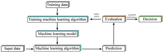 The working of machine learning is explained in Figure 3. Initially, the machine learning algorithm is trained with the training dataset (old data) in order to create a model. Here, the machine learning algorithms are trained with previous datasets. Once the machine learning model is trained, input data are provided for calculations and future prediction. Once predictions are obtained from the input data, these predictions are evaluated and matched with the actual results. If the predictions are close to the actual information, then decisions are made based on the predictions. In case the predictions are not close to the actual information (accuracy), then the machine learning algorithm is trained again with more historic data (training data), and the same procedure is applied again to get better prediction accuracy that is close to the actual information.