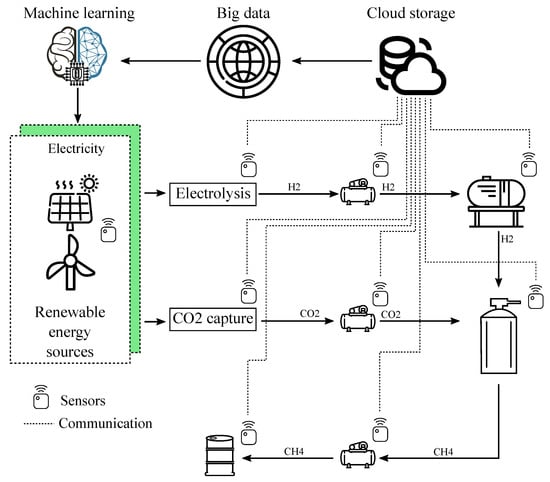 The IoT-based system is then composed of four interlinked stages. During the first stage, the IoT sensor devices are implemented in the whole physical infrastructure (renewable energy sources, electrolysis process, and hydrogen and methane storage) of the P2X process for data collection. During this stage, the data are from various parts of the proposed architecture, for example, solar panels, wind turbines, air pressure, atmospheric temperature, electricity price, the amount of electricity provided to the electrolysis process and CO2 capture, how much is generated and stored, how much and CO2 are utilized to generate methanol, and how much methanol is produced.