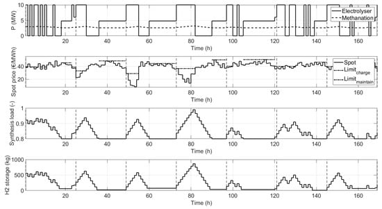 To generate the dataset to run the supervised learning, an in-house, time-consuming, reduced brute force method was used to determine the operation of the electrolyzer in order to minimize the levelized cost of methane (end product). An example for one week of operation is presented in Figure 6. As can be seen, the hydrogen storage is charged during the periods with cheaper electricity and discharged when electricity is more expensive. For the rest of the time, hydrogen is produced to only maintain the minimum part-load of the synthesis.