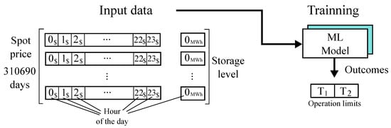 Machine learning model applied in the proposed study case. The input variables are the 24 h electricity price from the day-ahead market and the initial level of the storage unit at hour 0. The outputs are the two operating thresholds for that specific day.