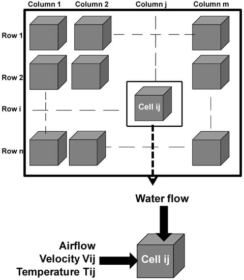 Passing through the detailed literature in the preceding section and the previous investigations by the authors of this article [22,23,24], it is observed that multiple numerical methods exist in order to characterize the effects of non-uniform distributions of airflow velocity and temperature on the HX thermal performance. Nevertheless, most methods share the concept of discretizing the heat transfer area into n × m cells and performing energy analysis locally on each cell, as shown in Figure 1.
