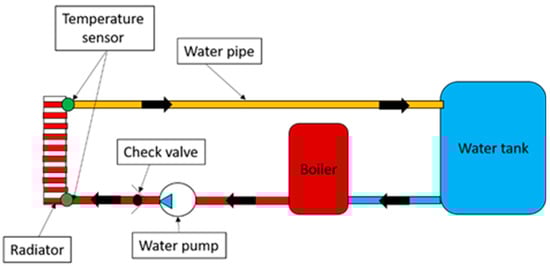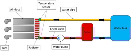 Table 1 lists the components of the thermal part of the experimental setup. A water tank is used for 100 L of volume capacity connected with a gate valve and equipped with an electric heater (3 kW). A hot water pump is used in the experimental setup. The head of the hydraulic pump is 10 m and the volume flow rate provided is 18 L·min−1. A pipe connection is installed in order to guide the flow and make a good connection between different parts. The used heat exchanger has a surface of 70 × 55 cm2, which is equipped by two temperature sensors installed at the inlet and outlet. Figure 2 shows the different parts of the entire assembly of experimental setup that has been investigated in the present project.