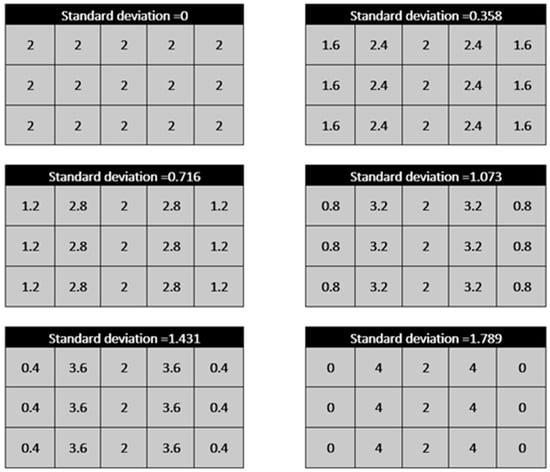 In each configuration of Figure 5 and Figure 6, the airflow velocity in each small duct (cell) was fixed in a manner to obtain a given standard deviation of the airflow non-uniformity upstream of the HX. This standard deviation is a representation of the non-uniformity in velocity distribution and is the main parameter that influences the thermal performance of the HX (see below). Configurations of Figure 5 and Figure 6 allowed finally obtaining for each mean air velocity six different airflow velocity distributions: each one characterized by a given standard deviation. The standard deviation is calculated using the following equation: