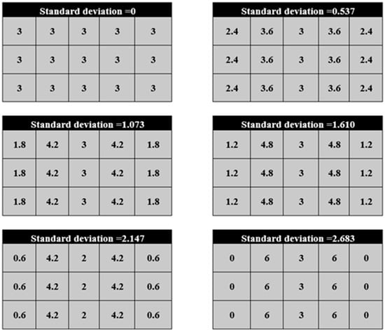 Each water flow rate will be tested with both mean air velocity values (2 and 3 m·s−1); each mean air velocity has six different non-uniformity configurations to be tested, which total 12 testing configurations for each water flow rate, with three water flow rates tested (200, 400 and 600 L·h−1); this leads to 36 testing configurations. The non-uniformity configurations for each mean airflow velocity are shown in Figure 5 and Figure 6.