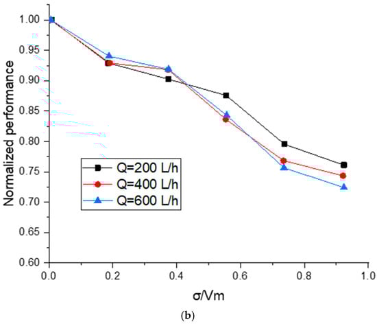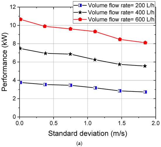 Figure 7b shows the normalized heat exchanger performance (with respect to , the performance for the case of a completely uniform flow, i.e., a standard deviation m/s) as a function of the standard deviation that is also normalized with the mean airflow velocity (Vm = 2 m/s). It is obvious that the curves are very close and a linear generalization can be obtained, which is: