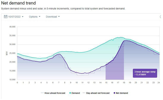 Figure 3 is an actual load curve from the California Independent System Operator (CAISO) for 7 October 2022 [8]. The load demand is shown in green and the electricity produced by the traditional units (net demand) is shown in purple. The difference between the green and purple curves is the electricity produced by wind or solar generation. This figure shows a very sharp increase of about 13 GW in 3 h due to the diminishing solar power around sunset.