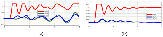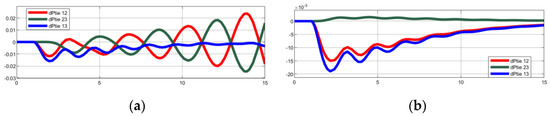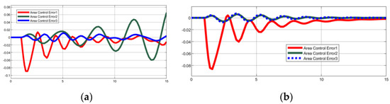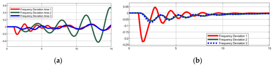 Figure 13 shows the tie-line power deviations In Figure 13a, for Case 3, these deviations are unstable, meaning that the power exchanges between areas are increasing. However, in Figure 13b, corresponding to Case 4, the three areas are helping each other during the disturbance by sending power to the area that is in difficulty, which is area 1 that has an increase in power demand. After area 1 has increased its own generation, the tie-line powers return to their scheduled values.