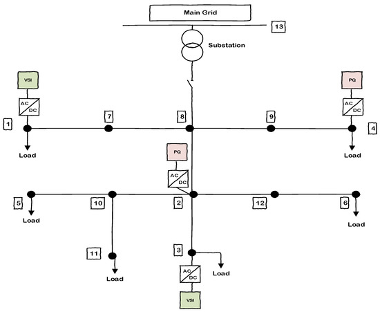 For illustration, a data-driven controller (secondary voltage control) is designed for a 12-bus test system, as shown in Figure 15. This system has four inverters connected to buses 1–4, where two of them operate in a Voltage Source Inverter (VSI) mode and the other two are controlled as PQ inverters. Regardless of the chosen secondary voltage control method, the voltage will be controlled by the VSI inverters. In other words, VSI inverters act as the actuators of this control system [10].