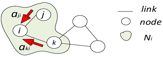 In the data-driven voltage control, a multi agent scheme is required where each agent communicates its data to other agents in order to reach a consensus and makes the appropriate control decision. The dynamics of those agents are given in Equation (3) and the applied consensus protocol is described by Equation (4) [20]. In these equations, , , and represent the control input, the state variables, and the components of the updating (adjacency) matrix, A = [], respectively [20]. Figure 16 illustrates the definition of the neighbors of node i and the elements of the adjacency matrix such as and .