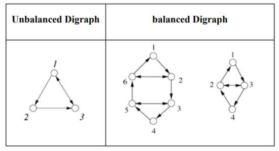 Having a strongly connected digraph ensures an agreement between the agents. However, this group decision value is not necessarily equivalent to the average of the node’s initial data. To achieve the average consensus, where the correct average value is the result of the agreement process, the digraph needs to be balanced as well as strongly connected. Here in Figure 17, examples of balanced and unbalanced digraphs are shown.