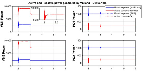 Figure 20, Figure 21 and Figure 22 demonstrate and compare the simulation results related to traditional decentralized and ACA-based voltage control. Figure 20 depicts the average voltage of six pilot buses in the presence and absence of ACA. It is confirmed that ACA can keep the average constantly around the selected average setpoint. Figure 21 shows the voltage of each pilot bus separately for the decentralized and the ACA-based voltage control when a load change happens at bus 4. In this figure bus 4 has the lowest voltage. However, with ACA it can be better restored as the control system is trying to keep the average voltage at a proper setpoint. Finally, in Figure 22, the active and reactive power produced by each inverter are shown separately. It demonstrates the fact that PQs will work the same in both approaches but its VSI’s contribution will be different.