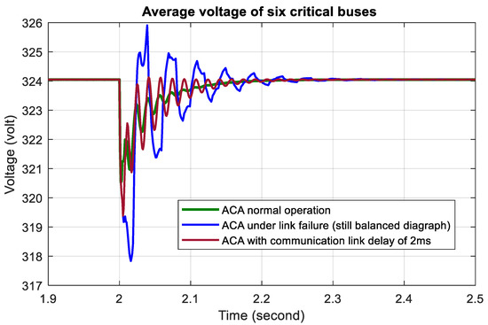 The performance of the ACA voltage control of the microgrid is highly related to the rate of data transfer [27] and the utilized updating matrix rules to reach an agreement quickly. If there is a delay in the communication link, it can lead to oscillations in the response, and eventually, it can lead the system towards instability.