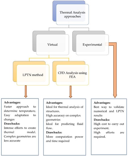 Thermal management of an IM requires the accurate prediction of temperature profiles using different thermal analytical approaches. Apart from experimental validation, CFD and LPTN are some of the commonly used analytical approaches. The advantages and disadvantages of different approaches have been highlighted in Figure 2.
