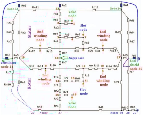 The lumped circuit model is a faster approach to determining the temperature profile within the IM, where the variations consequential from diverse input parameters could be rapidly determined by the user. The steady state or transient heat flow in an IM and the temperature of each component can be predicted using this model. The temperature profile of the system is found to be similar to that of the temperature profile found in the CFD simulation made through FEA, as long as the geometry remains simple. However, the major drawback of the LPTN model is the intense effort required for creating an accurate model []. In this model, complex geometry is presented by lumping different components of it into simplified areas [,,]. An example of lumped parameter thermal network of an electrical IM from Nair DG et al. [] is displayed in Figure 3 where the IM is of 37 kW capacity.