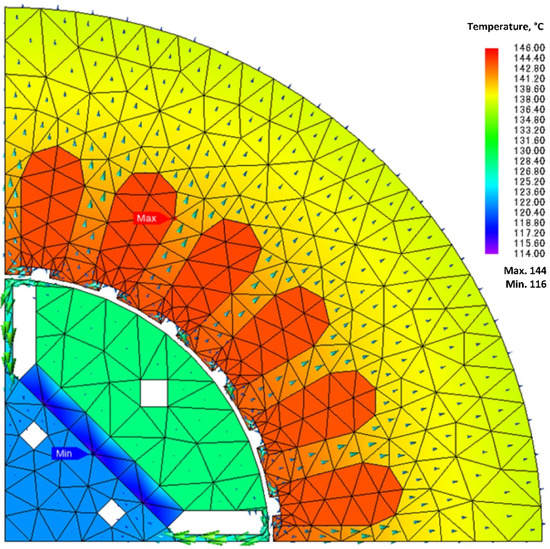 FEA software, AnSys Maxwell 2-D v.16, and AnSys Maxwell 3-D v.15, is considered to be one of the best for electromagnetics and is used to find the thermal characteristics in the transient state of the IM and the losses in power in the torque area in the steady-state []. It presents an investigation rise in IM when the effects of loading are taken into consideration. Software for FEA simulation, such as in [], can be used to predict sources of thermal energy caused as a result of electromagnetic losses—the eddy currents and hysteresis in magnets and laminations and the heating due to joule heating in the windings. The major merits of FEA over others lie in its ability to predict the flow in regions, such as around the end windings, which is considered complex []. For comparison with the LPTN model, a partial FEA thermal analysis, Figure 4 [].