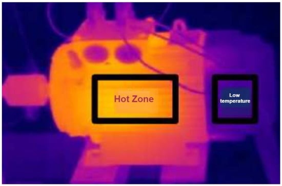 Temperature monitoring is done using direct thermal sensors by placing them on the end caps, windings, etc., [,]. Thermocouples, resistance thermometers, and thermistors are the most used thermal monitoring sensors. The principle on which thermocouples work is that a potential difference is created between two dissimilar metals, which increases with temperature. Quick response time, a broad range of measurements and simple configurations are its major merits. However, due to low signal strength, they are susceptible to electromagnetic interference. Thermistors are considered more accurate compared to thermocouples. The major merits of thermistor over thermocouple of simple geometry, small in size and low thermal mass. It is also susceptible to electromagnetic noises. In some cases where the sensors are difficult to place, infrared thermography is used as an indirect temperature measurement [,,]. Figure 5 shows the infrared thermal image of an IM [].