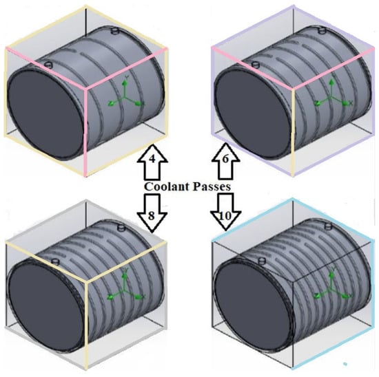 Rehman et al. [] conducted the 3D steady-state model investigation of a 90 kW IM with three different layouts of cooling jackets and four types of coolant flow passes. Four different water flows (5, 10, 20 and 30 LPM) were numerically studied. Maximum functioning temperature and pumping power were the key areas of focus in this investigation. The different configurations are shown in Figure 8 and Figure 9. The upper limit of the operating temperature for the design of the cooling jacket was set at 373 K. The highest temperature was observed to be in the stator winding due to intense heat loss from the winding loss. It was observed that the more the number of passes, the less the maximum temperature reached. Furthermore, the effect of varying the number of passes becomes less on increasing the passes beyond six, Table 6 and Table 7.