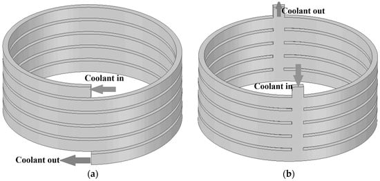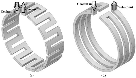 Satrústegui et al. [] presented a thermal model of an IC71 IM with different design criteria for the water-cooled system. The key parameters that describe the water jacket and shaft were identified through the use of a validated thermal model and CFD simulation. The topology of the water jacket was analyzed and it was observed that with similar cooling areas, Figure 10. The topologies were classified based on the pressure drop introduced in the cooling system. Spiral water jackets were chosen as the preferred option for reducing the pressure drop but were the most complex to manufacture. Later, two parameters that had almost no influence were determined, which were the interspace of cooling ducts and the distance between the ducts and the stator stack. Finally, the influence of water in these cooling arrangements was analyzed using CFD techniques. The temperature of some parts of the motor reduced significantly due to the enhanced coefficient of heat transfer by the use of water.