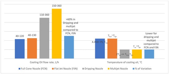 Tanguy et al. [] performed an experimental study on the oil cooling system for an electric motor. The focus of the study was to determine the influence of the oil temperature, rotation speed and oil flow rate on the cooling of the stator coil end cooling. The oil flow rate was changed between 40 and 360 L/h, the oil temperature between 50 °C to 75 °C and the speed between 0 to 4600 rpm. Different injection patterns, see Figure 11, were utilized to study the above factors, which have been summarized in Figure 12.