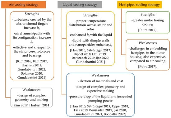 Moreover, various cooling strategies, such as air-cooled, liquid-cooled or heat pipe/plate cooled, can be employed to enhance the cooling characteristics of the machine []. In this paper, various thermal analysis approaches are contrasted. Additionally, various cooling strategies are discussed and compared, which refers to approaches for thermal analyses too. Thus, the study aims to broadly review the different aspects of the thermal management of IMs and suggest suitable changes, which will further improve the thermal efficiency of the machine.