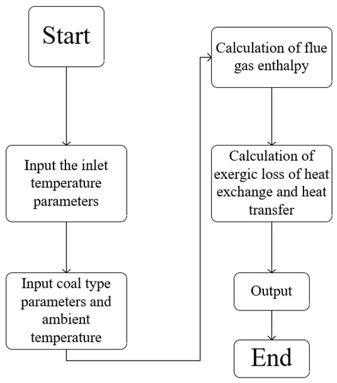 The exergy loss of each heat exchanger in the tail flue can be calculated according to the exergy analysis and calculation formula mentioned. The exergy loss of the heat transfer was programmed in Matlab to calculate the heat transfer. On the basis of Power Station Course Design Instructions, the boiler combustion calculation formula is established. The exergy loss of each heat exchanger in the boiler flue was calculated. The exergy loss distribution of each part can be clearly analyzed by this procedure. The flow of the program is shown in Figure 2.