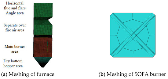 CATIA software was used to make a general assembly 3D model, and the analysis of the coal combustion process was carried out using FLUENT. Different grids were set up in each region by ICEM software. As a result, combustion characteristics and temperature distributions could be accurately determined. There were four main areas in ICEM for the boiler mesh. As shown in Figure 1a, the lowest part is the dry bottom hopper area, where the grid does not need to be encrypted, followed by the main burner area, the separate over-fire air (SOFA) area, and the horizontal flue and flare Angle area. As shown in Figure 3, the mesh with maximum density is located in the SOFA burner area. The horizontal flue and furnace arch are located at the top of the boiler. The inlet boundary conditions are shown in Table 3.