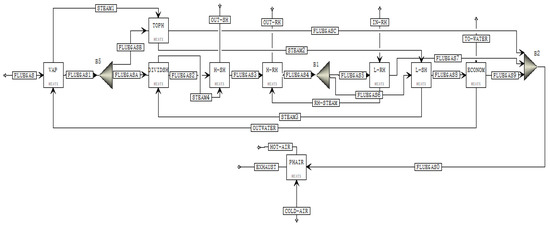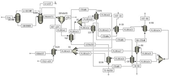 As shown in Figure 6, the HeatX module is used to carry out the design calculation according to the boiler design manual. The flue gas is divided into two streams, among which one flows through the low-temperature reheater (L-RH), and the other flows through the low-temperature superheater (L-SH) and the economizer (ECONOM). Then the two streams pass through the air preheater (PHAIR) and merge into the air. Before they can be discharged into the environment, these exhaust gases must be dedusted and reduced.